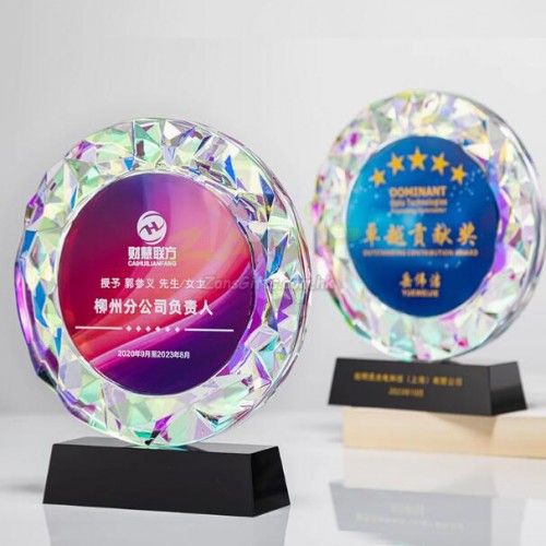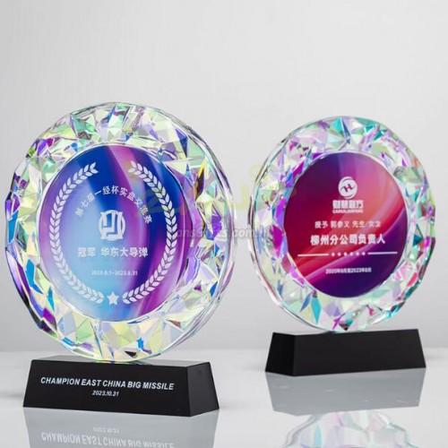 | 水晶獎座:水晶獎座有著水晶晶瑩剔透的優勢,手感細膩,還可以刻字,紋圖案,造型也基本可以達到金屬獎座的形狀。製作水晶獎座大致可分為選料、開料、壓胚、粗拋光、細拋光、打孔、鍍彩、雕刻、噴砂、包裝十個步驟。水晶獎座的雕刻工藝可分為平面雕刻和鐳射內雕。另外,基於訂製水晶獎座材質的特性,在運輸包裝與保養方面也有講究。 |