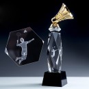 水晶獎座:水晶獎座有著水晶晶瑩剔透的優勢,手感細膩,還可以刻字,紋圖案,造型也基本可以達到金屬獎座的形狀。製作水晶獎座大致可分為選料、開料、壓胚、粗拋光、細拋光、打孔、鍍彩、雕刻、噴砂、包裝十個步驟。水晶獎座的雕刻工藝可分為平面雕刻和鐳射內雕。另外,基於訂製水晶獎座材質的特性,在運輸包裝與保養方面也有講究。