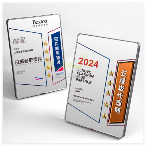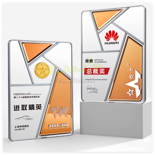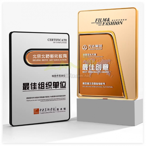 水晶獎座:水晶獎座有著水晶晶瑩剔透的優勢,手感細膩,還可以刻字,紋圖案,造型也基本可以達到金屬獎座的形狀。製作水晶獎座大致可分為選料、開料、壓胚、粗拋光、細拋光、打孔、鍍彩、雕刻、噴砂、包裝十個步驟。水晶獎座的雕刻工藝可分為平面雕刻和鐳射內雕。另外,基於訂製水晶獎座材質的特性,在運輸包裝與保養方面也有講究。