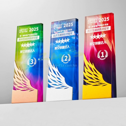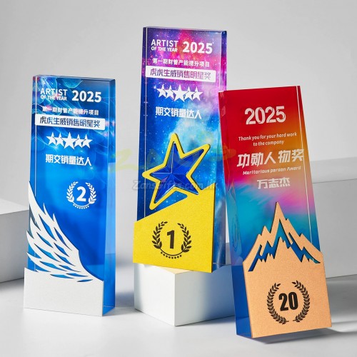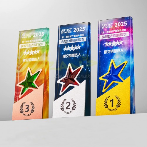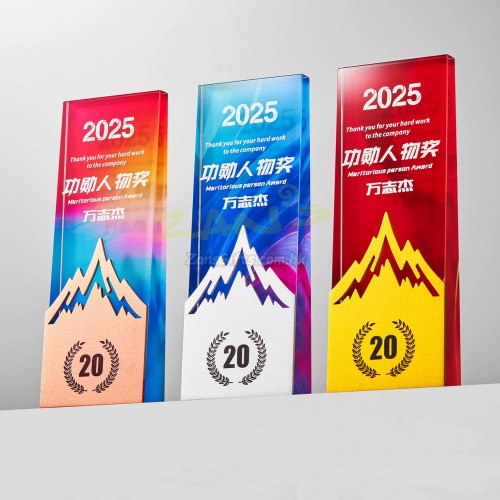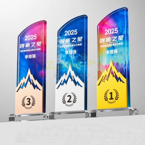 水晶獎座:水晶獎座有著水晶晶瑩剔透的優勢,手感細膩,還可以刻字,紋圖案,造型也基本可以達到金屬獎座的形狀。製作水晶獎座大致可分為選料、開料、壓胚、粗拋光、細拋光、打孔、鍍彩、雕刻、噴砂、包裝十個步驟。水晶獎座的雕刻工藝可分為平面雕刻和鐳射內雕。另外,基於訂製水晶獎座材質的特性,在運輸包裝與保養方面也有講究。 |