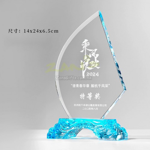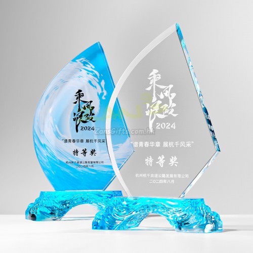 水晶獎座:水晶獎座有著水晶晶瑩剔透的優勢,手感細膩,還可以刻字,紋圖案,造型也基本可以達到金屬獎座的形狀。製作水晶獎座大致可分為選料、開料、壓胚、粗拋光、細拋光、打孔、鍍彩、雕刻、噴砂、包裝十個步驟。水晶獎座的雕刻工藝可分為平面雕刻和鐳射內雕。另外,基於訂製水晶獎座材質的特性,在運輸包裝與保養方面也有講究。 |