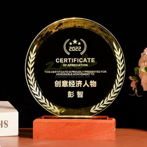 水晶獎座:水晶獎座有著水晶晶瑩剔透的優勢,手感細膩,還可以刻字,紋圖案,造型也基本可以達到金屬獎座的形狀。製作水晶獎座大致可分為選料、開料、壓胚、粗拋光、細拋光、打孔、鍍彩、雕刻、噴砂、包裝十個步驟。水晶獎座的雕刻工藝可分為平面雕刻和鐳射內雕。另外,基於訂製水晶獎座材質的特性,在運輸包裝與保養方面也有講究。
