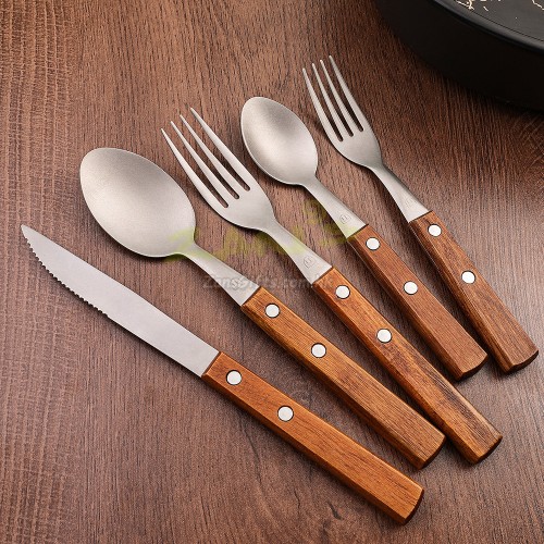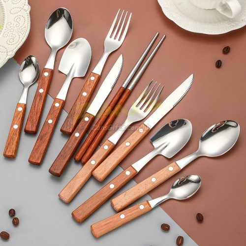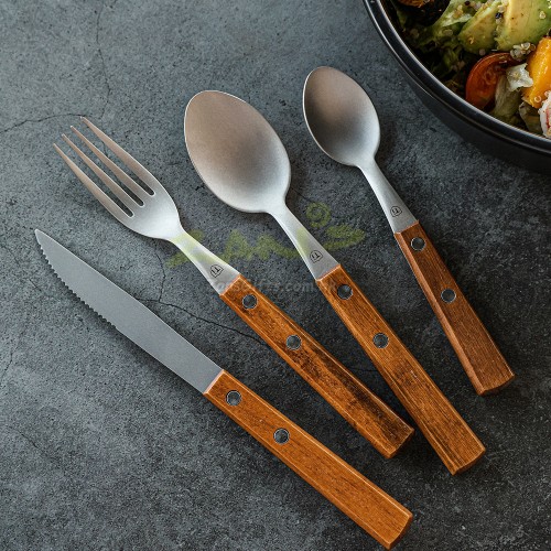 The wooden handle is anti-slip, heat-insulating and ergonomic, adding a warm touch to the metal tableware.