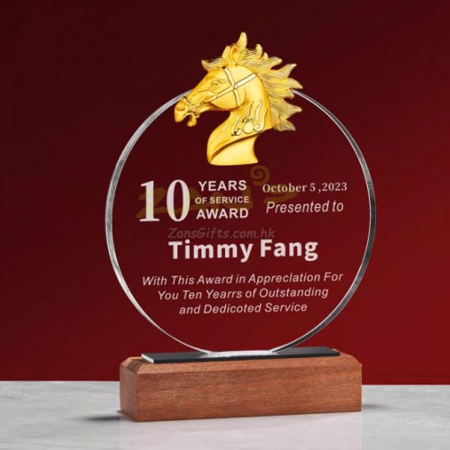 水晶獎座:水晶獎座有著水晶晶瑩剔透的優勢,手感細膩,還可以刻字,紋圖案,造型也基本可以達到金屬獎座的形狀。製作水晶獎座大致可分為選料、開料、壓胚、粗拋光、細拋光、打孔、鍍彩、雕刻、噴砂、包裝十個步驟。水晶獎座的雕刻工藝可分為平面雕刻和鐳射內雕。另外,基於訂製水晶獎座材質的特性,在運輸包裝與保養方面也有講究。