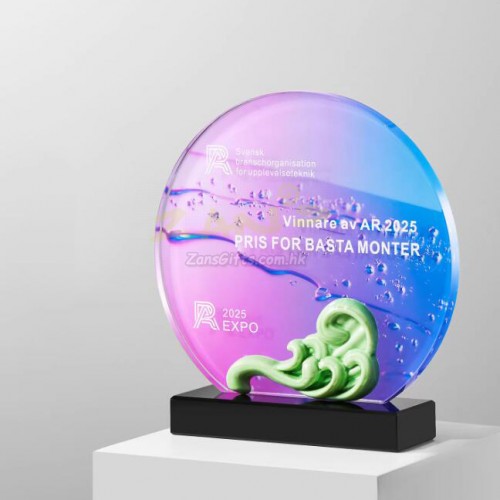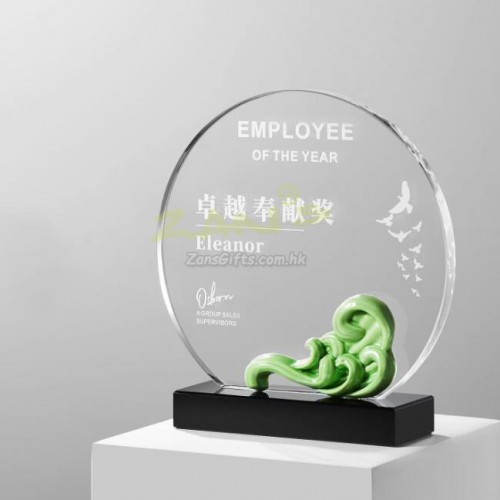 水晶獎座:水晶獎座有著水晶晶瑩剔透的優勢,手感細膩,還可以刻字,紋圖案,造型也基本可以達到金屬獎座的形狀。製作水晶獎座大致可分為選料、開料、壓胚、粗拋光、細拋光、打孔、鍍彩、雕刻、噴砂、包裝十個步驟。水晶獎座的雕刻工藝可分為平面雕刻和鐳射內雕。另外,基於訂製水晶獎座材質的特性,在運輸包裝與保養方面也有講究。